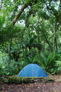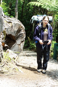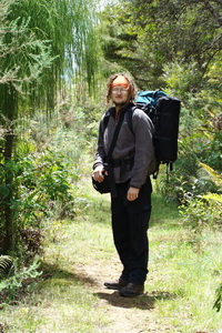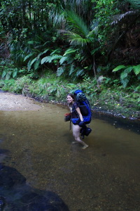 Zvolili jsme cestu kolem Waipapa River na Camp Creek (cca. 5 hodin chůze). Šlo se asi stokrát nahoru a dolů a několikrát jsme přecházeli řeku Waipapa – někdy jsme jen přeskákali po kamenech, jindy jsme museli sundat boty a kalhoty a přebrodit se. Ono se to nezdá, ale taková chůze pralesem docela unaví. Byli jsme rádi, když jsme asi půl hodiny poté, co začalo poprchat, narazili na nápis Camp Creek – no nepředstavujte si žádný kemp, to místo vypadalo jako všechno okolo, jen tam byl rovný plácek na 2 stany a ohniště, kolem džungle.