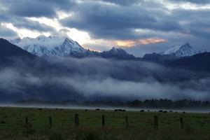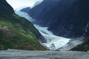 24.12. – opět celodenní déšť. Tentokráte ale již ne jen takové nějaké pršení, ale husté, silné provazce deště, takže na deseti metrech cesty od auta do informačního centra jsme byli promočení, jakoby nás polil konví. A pak 10 minut sluníčko. Pak 20 minut déšť. A celý den pořád dokola. Dnešní den jsme chtěli vyhradit ledovcům – Franz Josef Glacier a Fox Glacier, ovšem viditelnost byla mizerná (zataženo, mlhy) a kvůli zvedlým hladinám řek byly asi 500 metrů před ledovci zábrany, aby lidi nemohli blíž, protože to bylo nebezpečné. Tak jsme si je aspoň od zábran vyfotili. Odpoledne jsme navzdory dešti oblékli pláštěnky a vydali se na obchůzku jezera Matheson, v němž se za hezkého počasí odráží zasněžené vrcholky hor s ledovci. Nikoliv však za deště. No ale aspoň jsme se prošli. Zato se nám povedlo vidět tzv. kea – velkého zeleného novozélandského papouška, který je poměrně vzácný. Vytrvalé deště mají jednu výhodu - nepotkáváte moc turistů...
